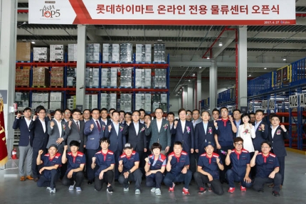 이동우 롯데하이마트 대표(두번째 줄 가운데)가 온라인 전용 물류센터 오픈 행사에서 임직원들과 기념촬영했다.